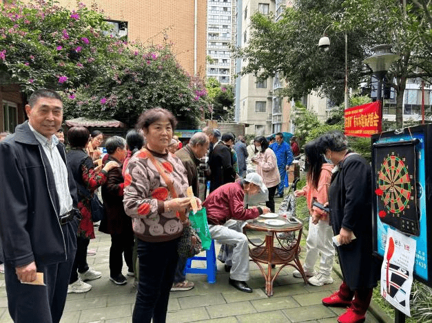 本次游园活动包括筷子夹弹珠、磁力飞镖、垃圾分类趣味模拟以及暖心水饺公益DIY共4个。活动开始后,居民有序地在签到处排队进行签到、领游戏券,拿到游戏券,居民们便迫不及待的依次去体验现场的活动了。游园活动区,筷子夹弹珠、磁力飞镖、垃圾分类趣味模拟......每一个游园摊位都吸引了众多居民的驻足与参与,大家积极的研究讨论怎么样用力才能让飞镖正中圆心,将滑溜的弹珠夹起来不掉,菜叶、过期化妆品、用完的电池等垃圾分别属于哪一类,欢笑声、加油声此起彼伏,满满的都是节日欢愉;暖心水饺区,大家一起将调好的馅料包进圆圆的饺子皮里,一边捏水饺,一边开心的聊着天,不一会儿,暖呼呼的水饺便出炉了。最后大家凭借着盖满章的游戏券到兑奖处兑换重阳纪念品,品尝新鲜出炉的暖心水饺,大家脸上都洋溢着开心的笑容。